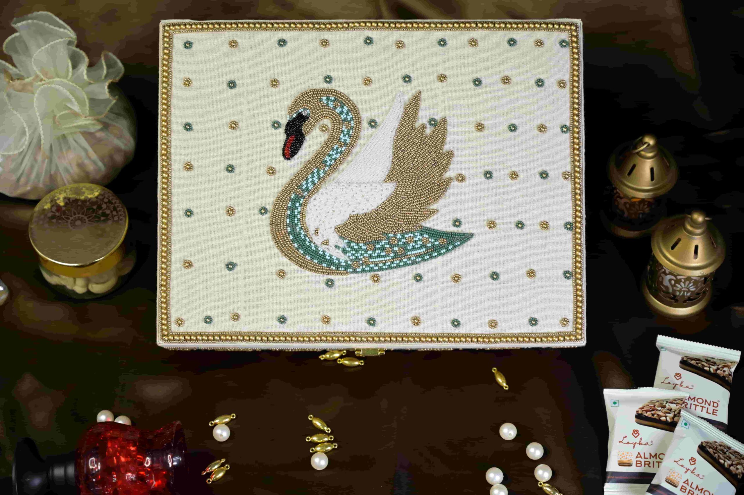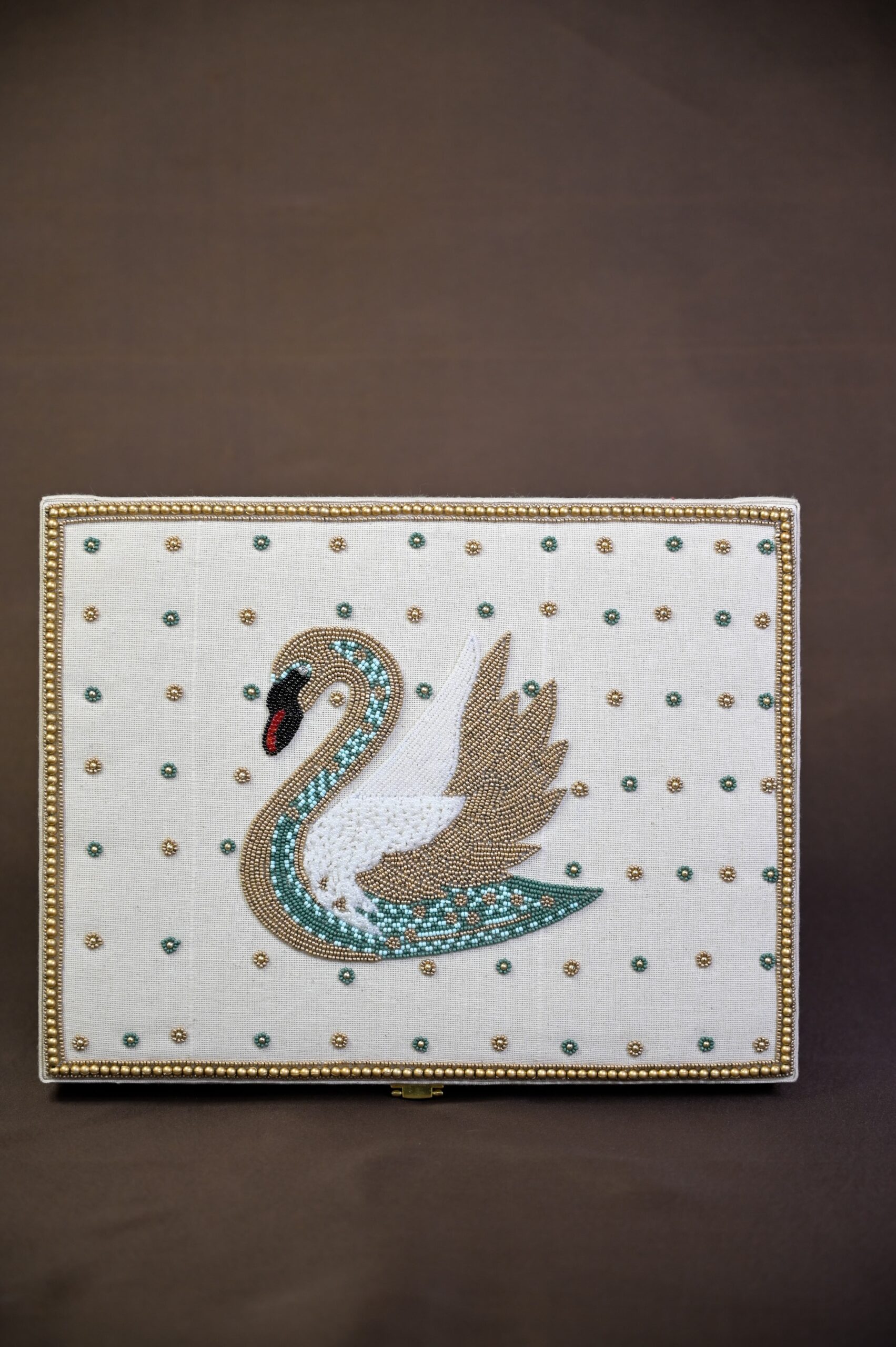 Each box is a masterpiece, featuring intricate embroidery inspired by the opulent Bird design. Delicate swan motifs, enhanced with golden beads, and sequins work, make this piece a luxurious addition to your collection.