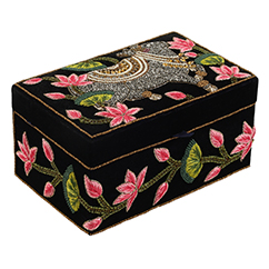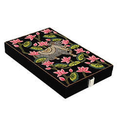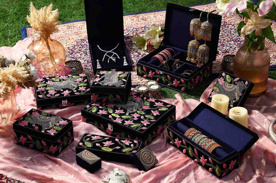 Handcrafted trousseau boxes capture the essence of Pichhwai art. Exquisite colors and intricate details, reminiscent of Lord Krishna’s stories, adorn these luxurious treasures, adding a touch of timeless elegance to your wedding collection.