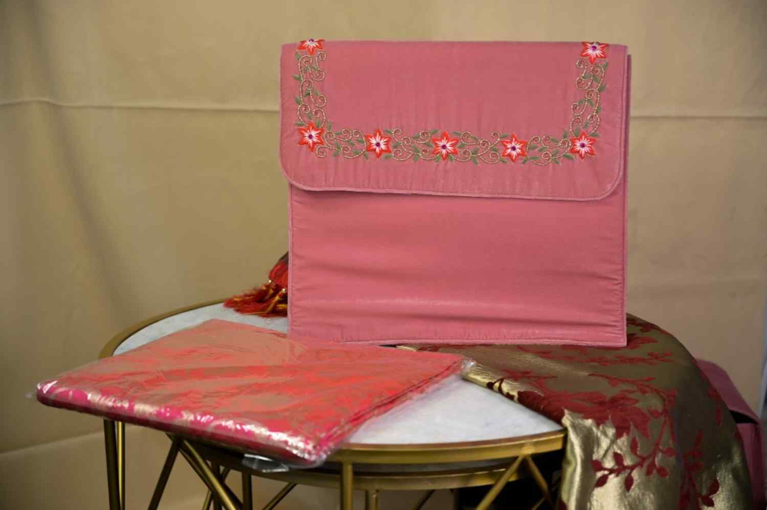 Adorned with delicate floral patterns, inspired by the soft, romantic hues of a blush garden. This cloth cover features fine embroidery, intricate patterns, and luxurious textures, and the detailed craftsmanship adds a regal touch, making it a perfect complement to your treasured sarees or suits.